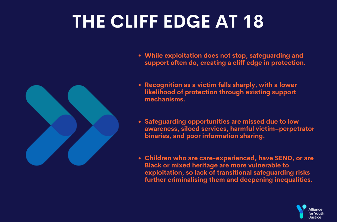 Exploitation does not end at 18 but safeguarding and support often do, creating a cliff edge in protection, with victims at increased risk of being criminalised as the criteria for being seen as a victim suddenly shift for young adults.